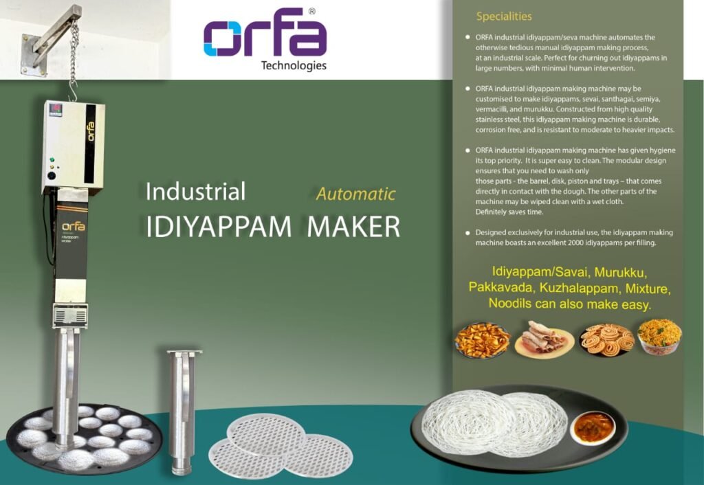 ORFA industrial idiyappam making machine may be customised to make idiyappams, sevai, santhagai, semiya, vermacilli, and murukku. Constructed from high quality stainless steel, this idiyappam making machine is durable, corrosion free, and is resistant to moderate to heavier impacts. ORFA industrial idiyappam making machine has given hygiene its top priority. It is super easy to clean. The modular design ensures that you need to wash only those parts – the barrel, disk, piston and trays – that comes directly in contact with the dough.